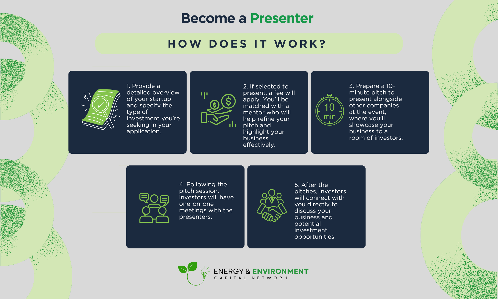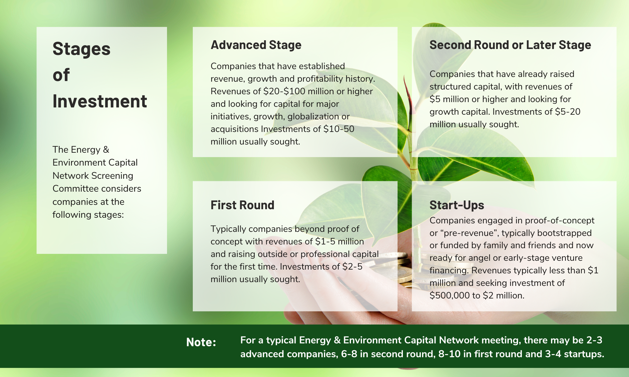 Energy & Environment Capital Network invites companies like yours to apply to become a presenter at our upcoming events.