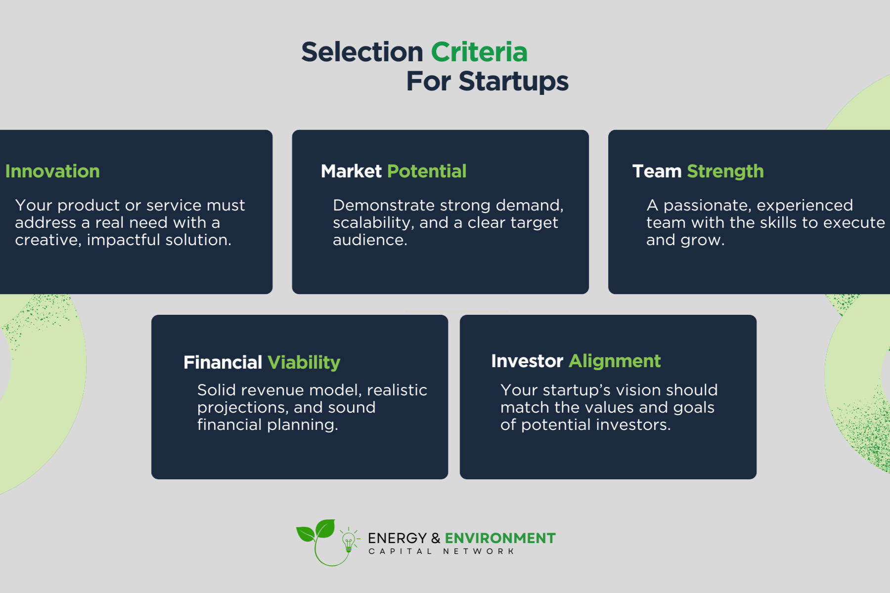 - Alignment with Investor Values: Investors in Energy & Environment Capital Network are not only looking for financial returns but also for alignment with their values. This means they are interested in companies that are making a tangible impact on environmental sustainability and advancing solutions that benefit both the planet and society at large.